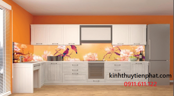 - Kính màu ốp bếp in tranh 3D: Hoa văn được in trực tiếp lên bề mặt kính tạo cho căn bếp thêm phần sinh động với những hình ảnh thực tế theo yêu cầu của khách hàng.